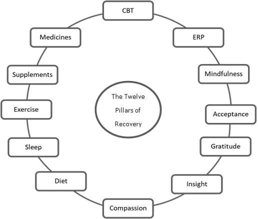 There are twelve pillars of recovery from OCD, as shown in Figure 2.4.1. Working with these twelve pillars will speed up your recovery process. The first two pillars to recovery are Cognitive Behavioral Therapy (CBT) and ERP. Although ERP is a specialized type of CBT, I have kept the two separate because CBT includes psychoeducation that helps modify behavior through ERP. Hence, these are the first two pillars. The next five pillars have the acronym MAGIC (mindfulness, acceptance, gratitude, insight, compassion). The next four pillars are diet, sleep, exercise, and supplements. The twelfth pillar is medicines. Out of these twelve pillars, this course book will mainly focus on the first seven pillars, i.e., CBT, ERP, mindfulness, acceptance, gratitude, insight, and compassion.